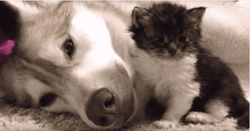 Poglejte, kako je maček pritrjen na psa. Zdi se, da se je celo začel šteti za pasjega mladička.