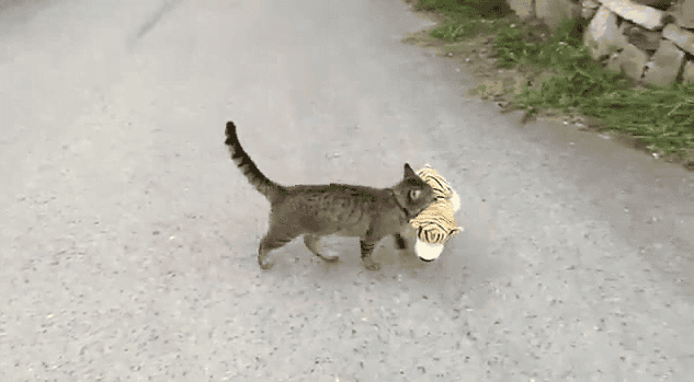 Maček se je odločil, da si bo od soseda ‘izposodil’ igračo tigra, ki je bila velika skoraj, kot mačji mladič.